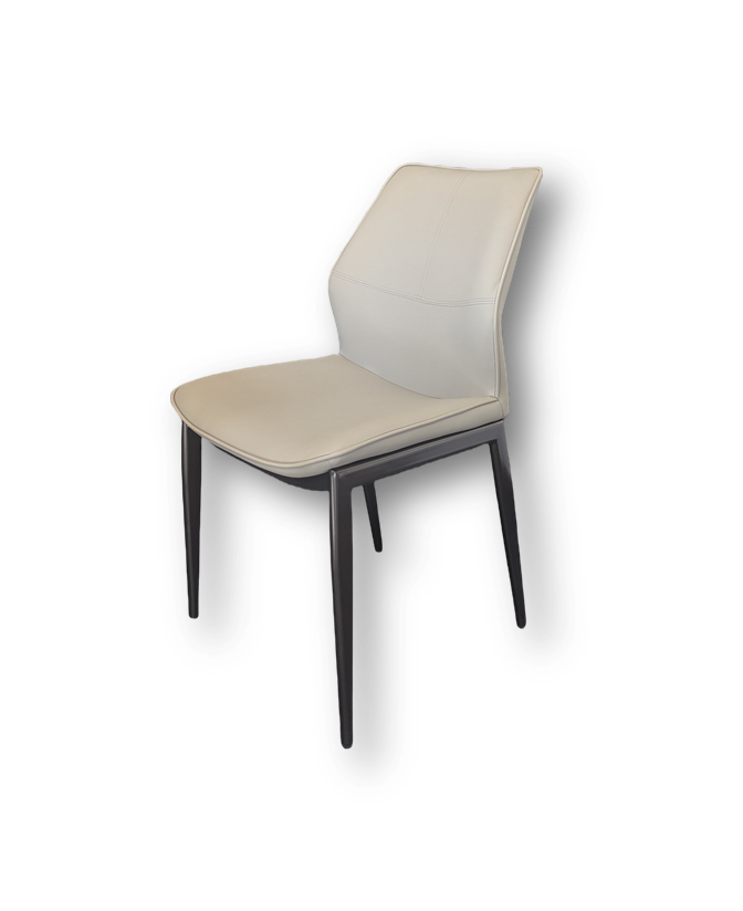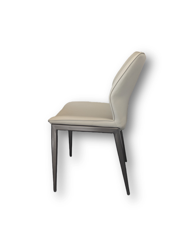 This Benito dining chair is wrapped in light-gray PU leather with dimblack carbon steel legs for a refined contrast. The cushioned seat and lumbar support ensure comfort through every course. The powder-coated metal frame offer lasting strength and resistance to daily wear. A perfect blend of comfort and style, it makes every gathering feel effortlessly luxurious.