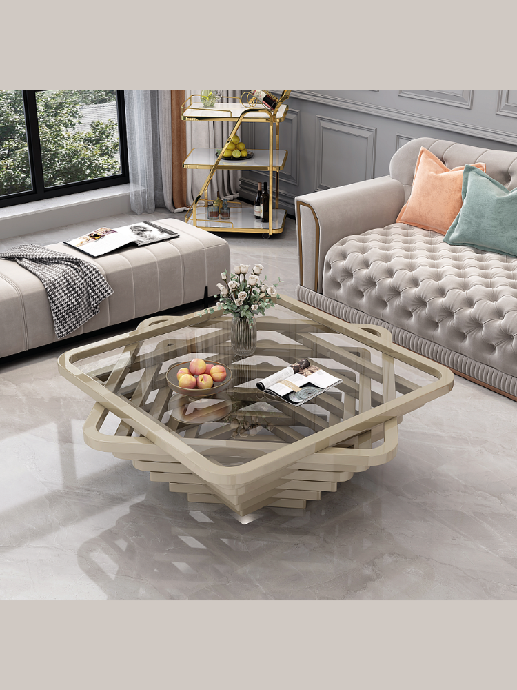 Elevate your living room with this architectural masterpiece. The Claudio geometric coffee table features a striking parametric design, characterized by its layered, stacked-frame base that creates a captivating visual interplay of light and shadow. Furthermore, the spacious square top is crafted from high-quality tempered glass, allowing the intricate steel structure below to remain the focal point.