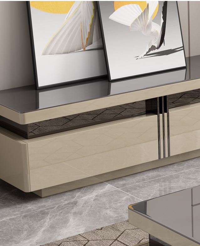Bring modern elegance to your living room with the Contessa TV Stand. Featuring a sturdy base and a dark charcoal glass top, it securely supports wide-screen TVs while providing ample storage for media consoles. Crafted from high-quality wood with a light tan high-gloss finish and sleek stainless steel trim, this TV stand complements any contemporary interior.