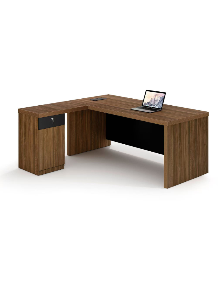 The Elowen L-shaped desk is a heavy-duty, professional workstation. Built with a rich American Walnut finish and a modern black modesty panel, it combines style with durability.