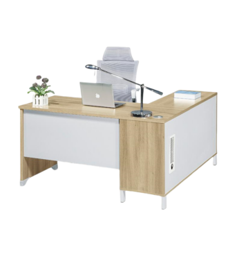 Desk: 8cm thickness desk top, black leather inlay, leather padded front panel and side, H80 x W220 x D110cm